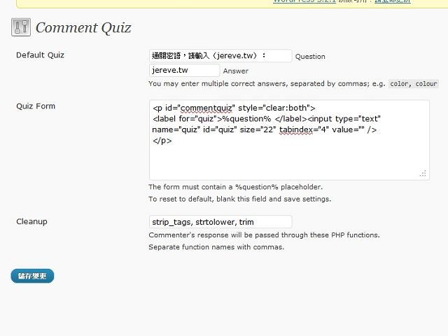 不知道有沒有人發現 blog 有個地方變得不一樣啦,剛剛麻煩貓大爺幫我多安裝了一個 Quiz 的外掛,讓我總算可以擺脫越來越多、多到我快發瘋的垃圾留言,其實在貓大爺搞定之前,我還不知道這是簡單一個外掛弄出來的效果,我以為在各別頁面去增加語法就好了,看來這方面我還真是傻傻什麼都不懂阿(慚愧),好像太依賴貓大爺了。