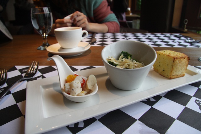 這應該是傳說中的私房前菜了,最左邊我也不知道該稱它什麼,中間是鬍鬚菜跟牛蒡絲,右邊是香蒜麵包。這前菜我覺得擺盤驚艷,吃起來還好,但回味無窮(?)特別是香蒜麵包,呵呵,其實不差啦,只是心目中還有更愛的前菜而已。