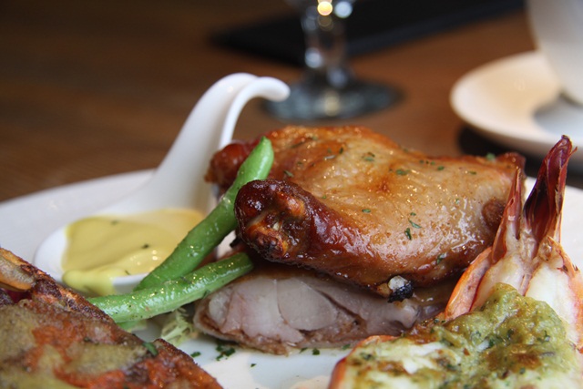 主廚海陸脆皮雞排(荷蘭汁焗烤明蝦/酥炸軟螃蟹),四季豆我有吃,蝦子也吃了(不用剝殼的不吃對不起自己(笑)),螃蟹跳過(我不知道怎麼下手(otz)),脆皮雞腿很好吃,特別是酥酥的皮,嫩嫩的肉,愛死了,就跟我現在吃燒烤最喜歡點雞肉一樣。差點忘了,那個黃色的沾醬是黃芥末,雞肉沾那個醬吃很別緻,一點點添加一點風味,多一點味道嗆鼻但美味。