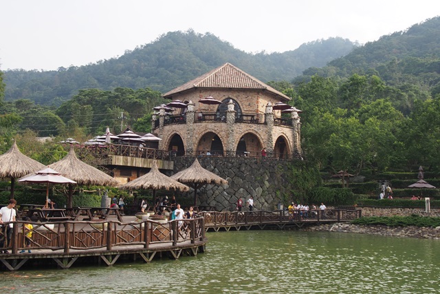 在茅草亭前餵完魚之後我們沿著湖畔走,照片中就是剛剛用餐的「六角亭餐廳」和「茅草亭」。