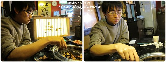 右上角是我愛的雞腿肉,大概是人太多供不應求,肉都還沒完全解凍就上桌了(窘)。話說我蛤蜊絲瓜點了兩次怎麼都沒有來?太奇怪,只好改點金針菇,然後再點一次烤麻糬,不過我還是喜歡另一間的烤麻糬比較好吃,也或許是我們不會烤吧。