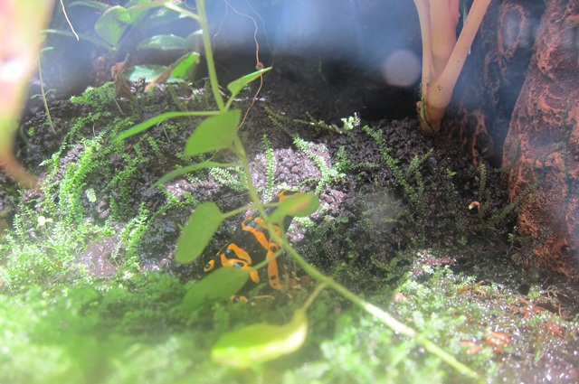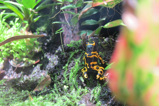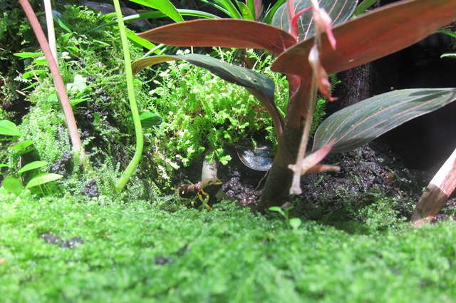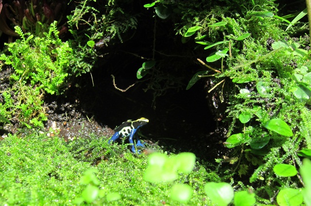 當我正拍著上面那隻蛙時,香腸一直吵著這隻這隻,好啦,弟弟乖,我拍我拍(笑)。的確,這隻也很特別,牠是「染色箭毒蛙」那雙藍藍的後腳好美,那個藍好美啦。