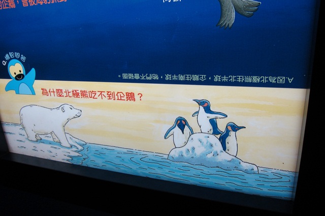 在看了企鵝的餵食秀之後,我放棄地離開了,再拍下去我會瘋掉,而離開前看到這張貼在牆上的圖,我果然不適合這種動腦的東西,虧我還認真的問了香腸答案,看到答案時我都想殺人了,整個就很白癡(翻桌)。北極熊 v.s. 企鵝!!根本沒機會麻。